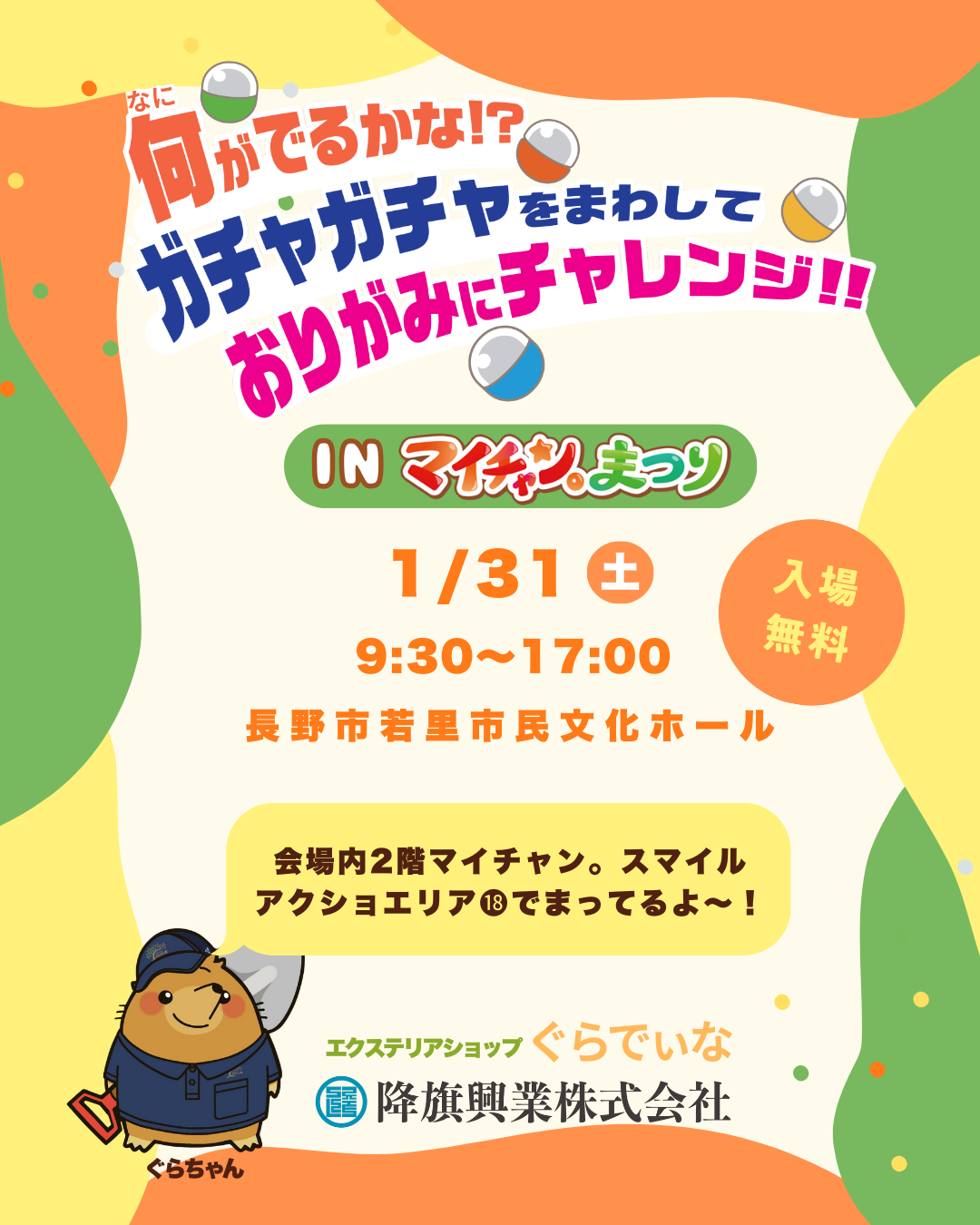 ガチャガチャからは、おりがみと弊社キャラクター「ぐらちゃん」のシールが出てきます。